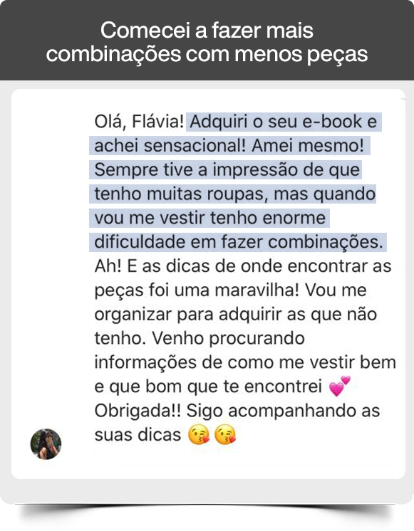 É um ebook digital ilustrado, criado para simplificar a sua rotina na hora de se vestir. Ele mostra como ter um guarda-roupa inteligente, atemporal e versátil, capaz de multiplicar combinações com pouquíssimas peças.
